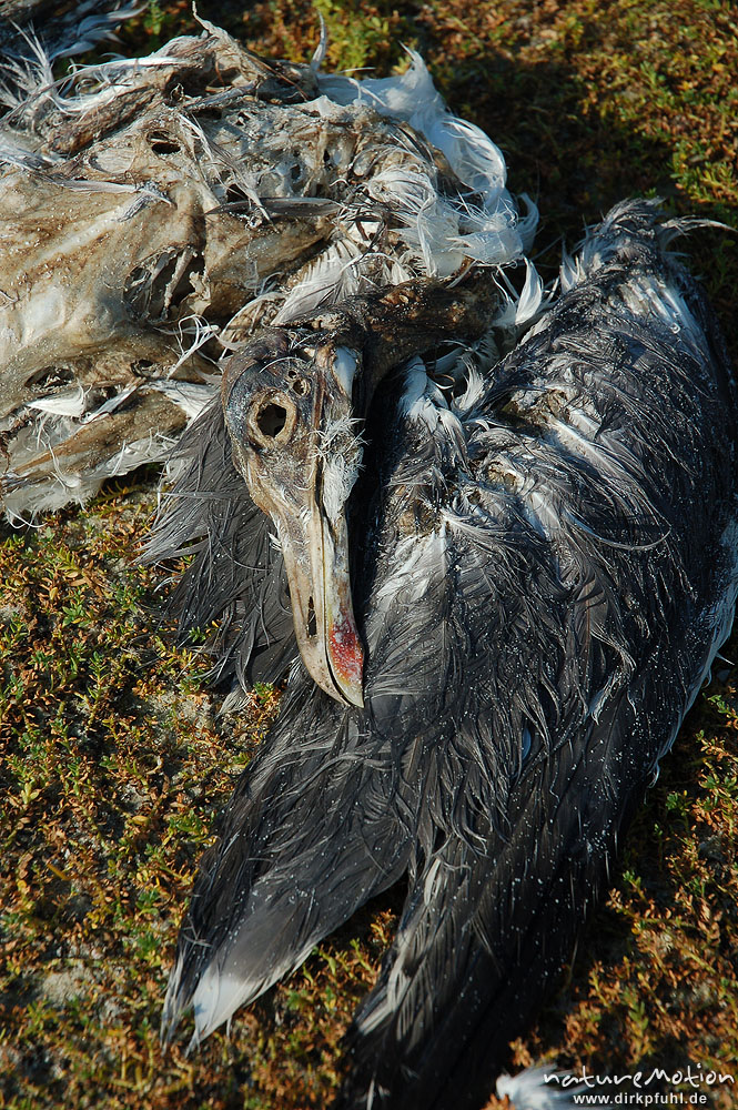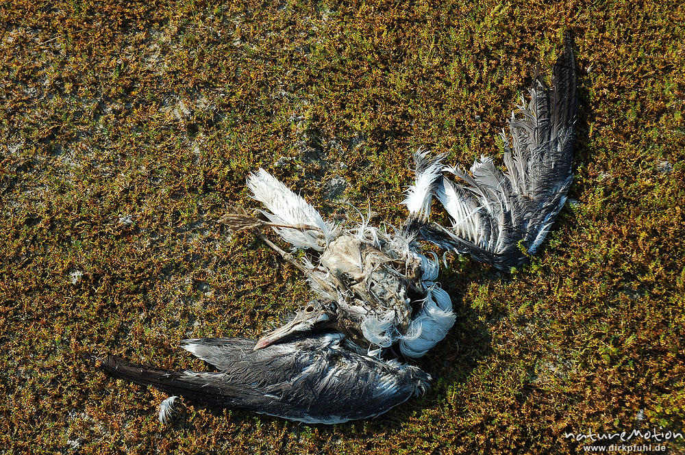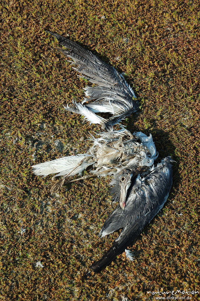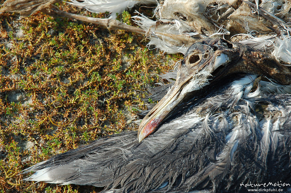 tote Möwe inmitten grün bewachsener Dünen, halb verwest, ...