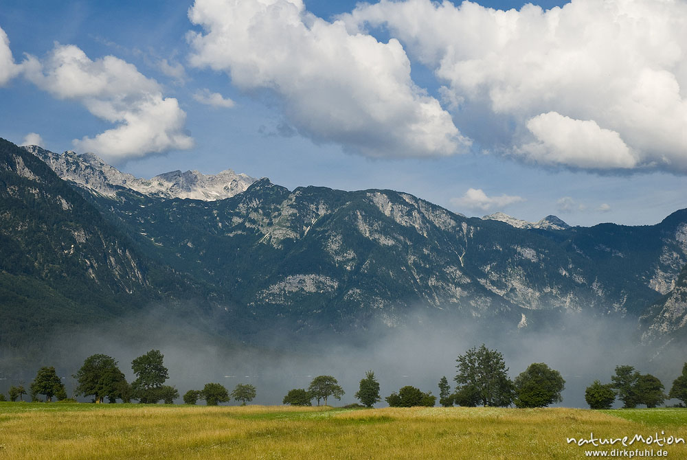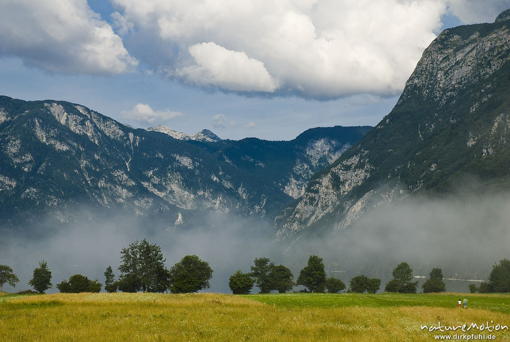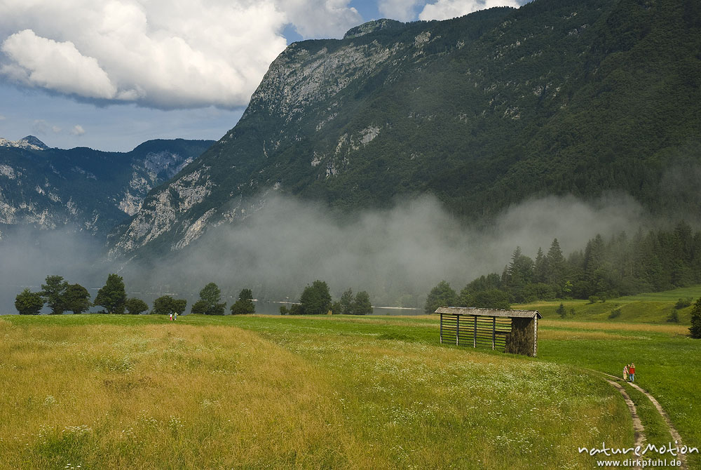 Wiesen und Nebel am Seeufer, Bohinjer See Wocheiner See, Slo ...