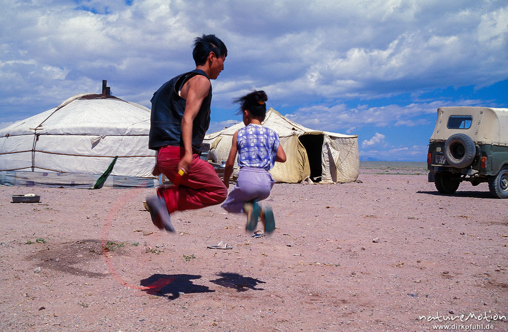 Kinder beim Seilspringen, Wüste Gobi, Mongolei ...
