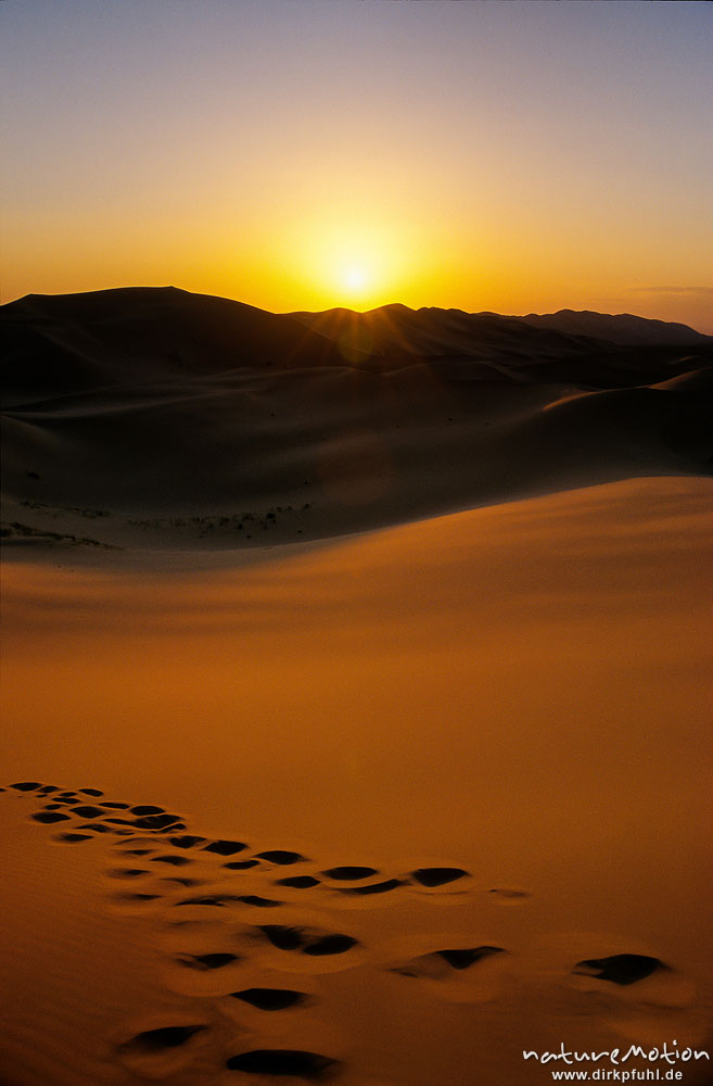 Fußspuren auf dem Kamm einer Wanderdüne, Chongorin Els, Mo ...
