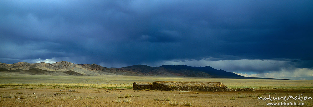 gemauerter Stall für den Winter inmitten karger Steppe, Mon ...