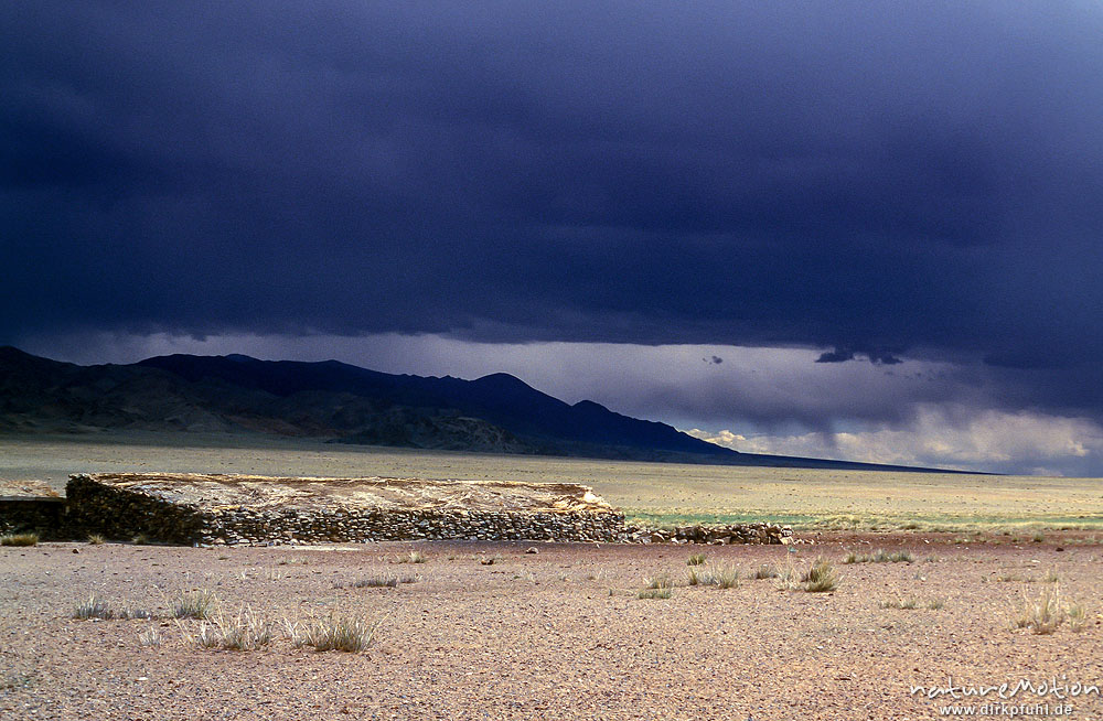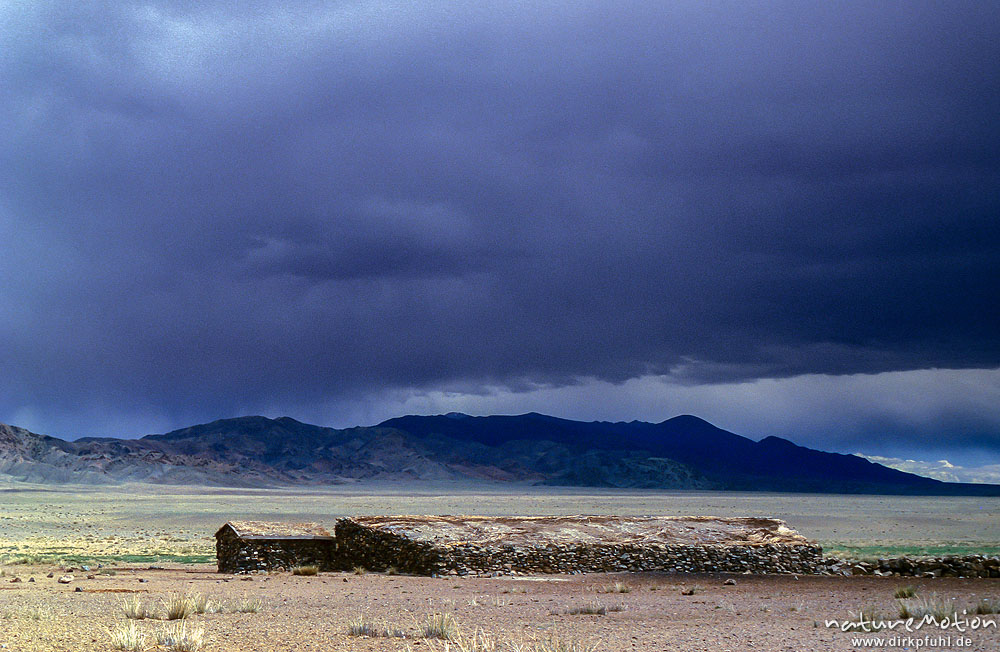 steinerner Stall für den Winter inmitten steingier Steppe, ...
