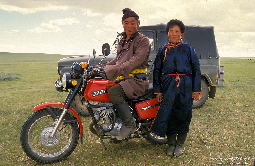 Mann und Schwester vor ihrem Motorrad, Wüste Gobi, Mongolei ...