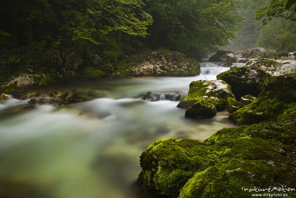 Bergbach mit moosbewachsenen Felsen, Nebel und Regen, Mosnic ...