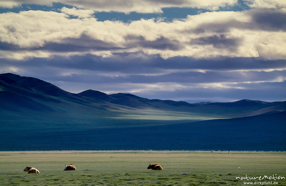 liegende Kühe, Steppe mit Höhenzügen, bewölkter Himmel, ...
