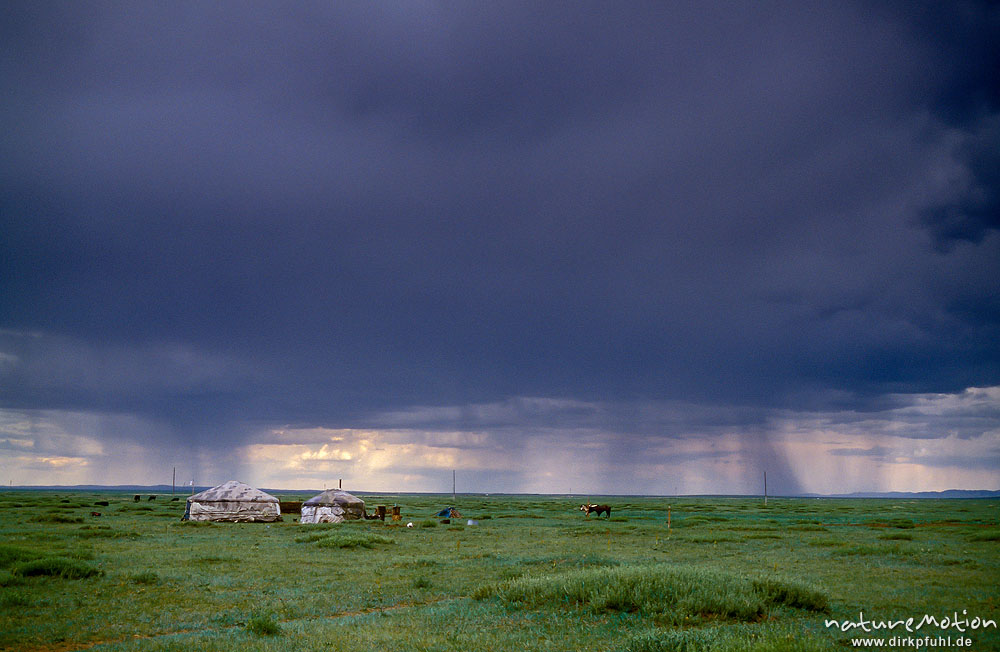 weite, flache Steppe mit einzelnen Jurten, typische Landscha ...