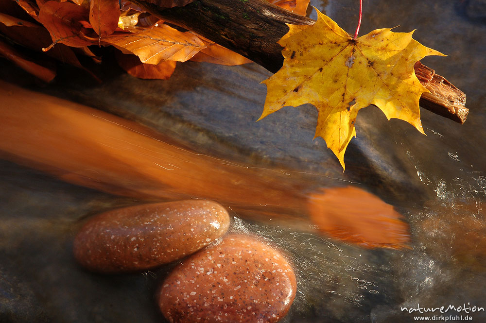 Spitzahornblatt auf Ast über strömendem Wasser, Kiesel, im ...