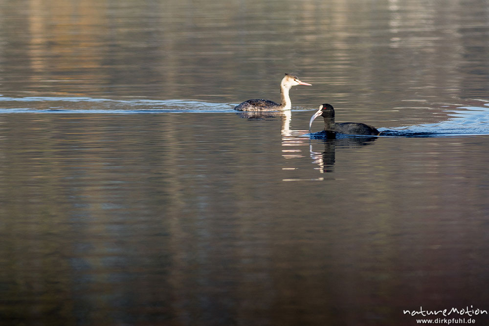 Haubentaucher, Podiceps cristatus, Podicipedidae, schlägt m ...