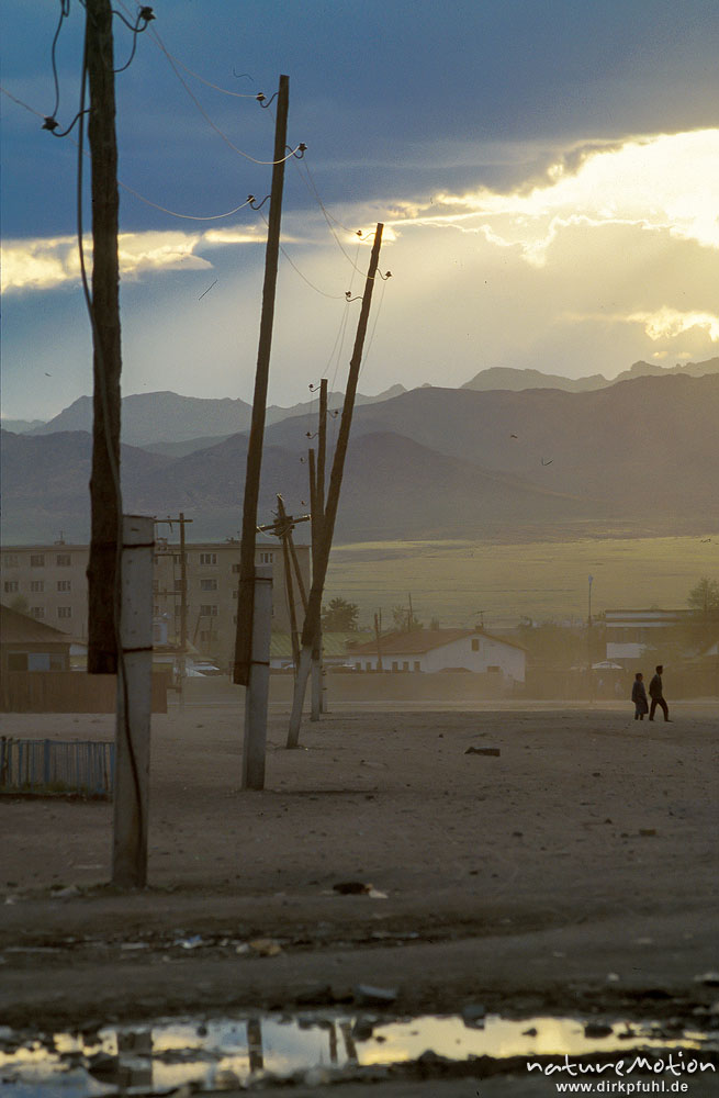 schiefer Strommast, Platz in Chowd, Passanten, Chowd, Mongol ...