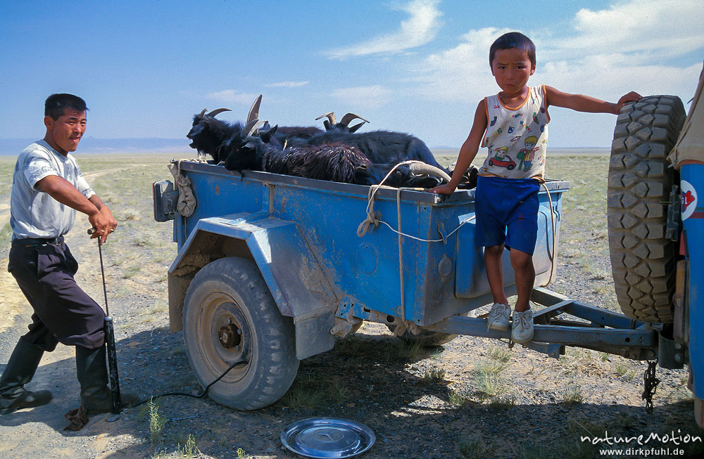 Reifenreparatur unterwegs, Anhänger mit Ziegen, Mercedes-Ra ...
