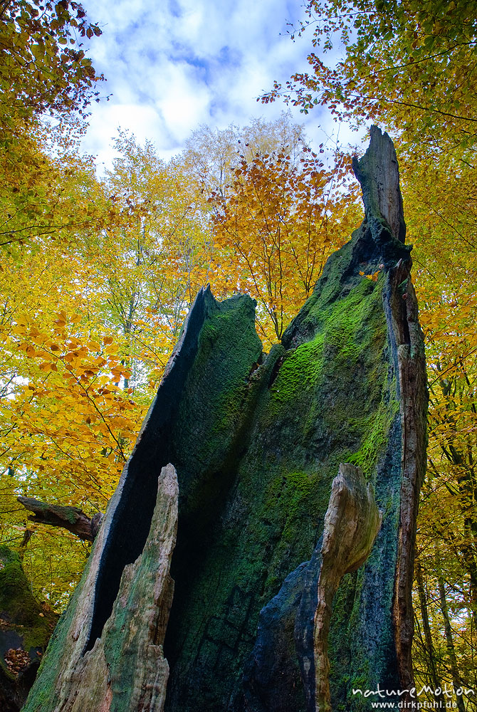 verwitterter Baumstumpf, hohl, moosbedeckt, ragt in den Himm ...