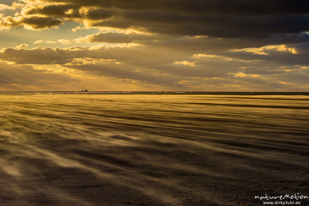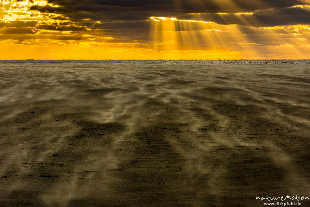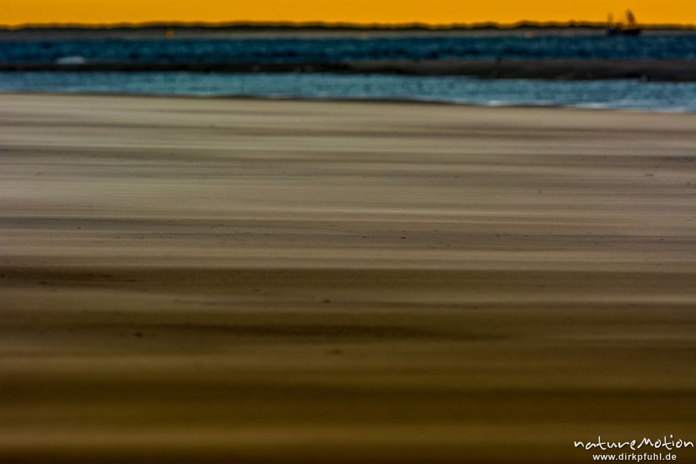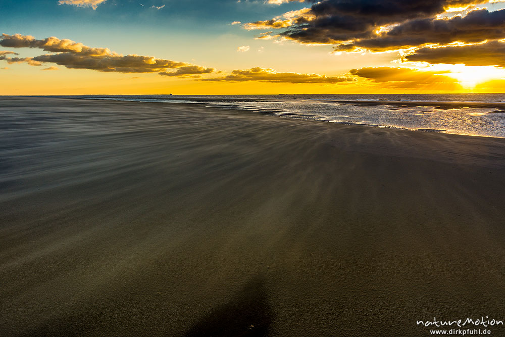 Sonnenuntergang über dem Meer, wehender Sand, Hohes Riff, B ...