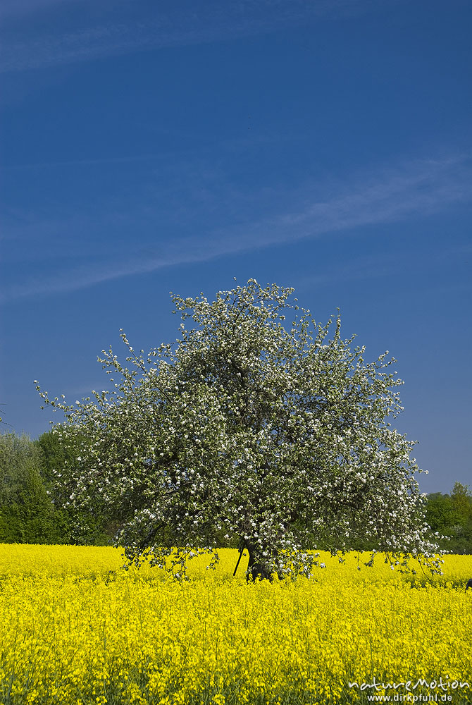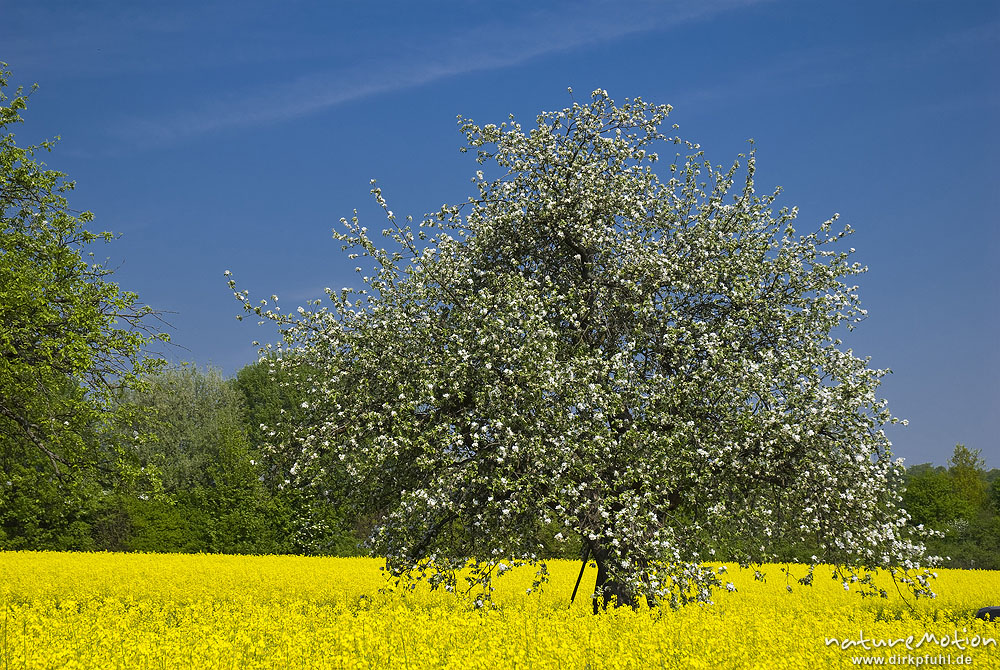 blühender Apfelbaum inmitten Rapsfeld, Niederhöchstadt, De ...