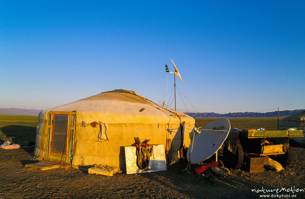 Jurte mit Windgenerator und Satelitenantenne, Wüste Gobi, M ...