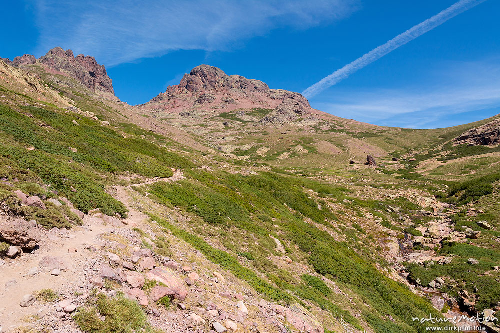 Tal des Golo, Blick auf Paglia Orba, Weg zur H?tte Ciottuli di i Mori, ausgetretener Wanderweg GR 20, Korsika, Frankreich