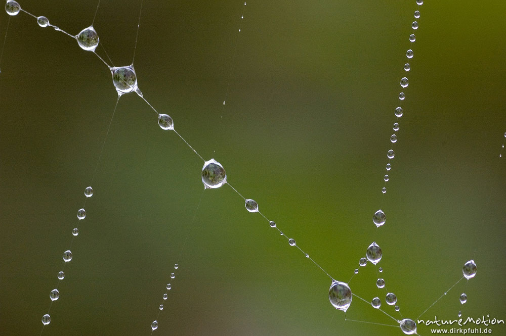Tautropfen in Spinnennetz (Wespenspinne, Argiope bruenechii, Araneidae), Tripkenkuhle, Göttingen, Deutschland