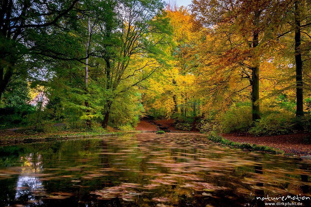 Teich mit Herbstlaub, Bäume in Herbstfärbung, Blätter treiben auf Wasseroberfläche, lange Belichtungszeit, Schillerwiesen, Göttingen, Deutschland