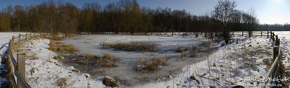 Teich, zugefroren, Eisdecke, Ufervegetation und Zaun, Tripkenpfuhl, Herberhäuser Stieg, Göttingen, Deutschland