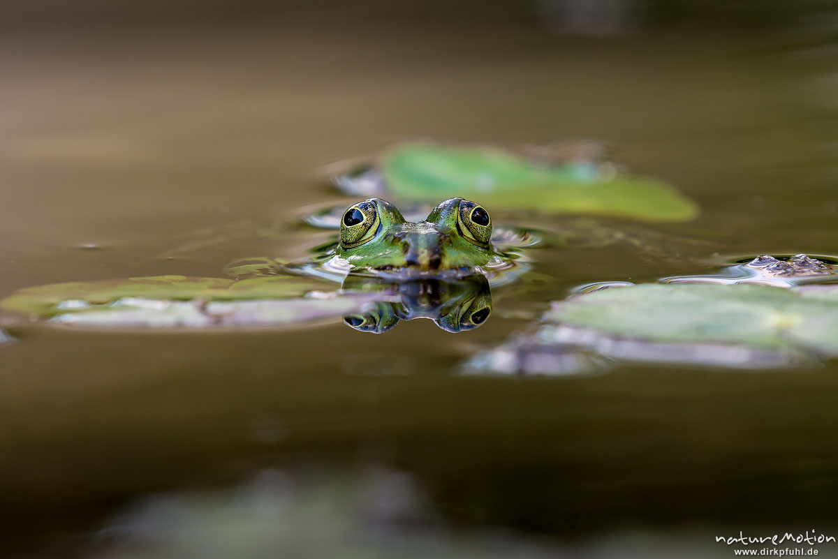 Teichfrosch, Rana esculenta (Pelophylax kl. esculentus, Pelophylax "esculentus"), Echte Frösche (Ranidae), Tier in Zierteich im Alten botanischen Garten, Portrait von vorn, Augen spiegeln sich, Göttingen, Deutschland