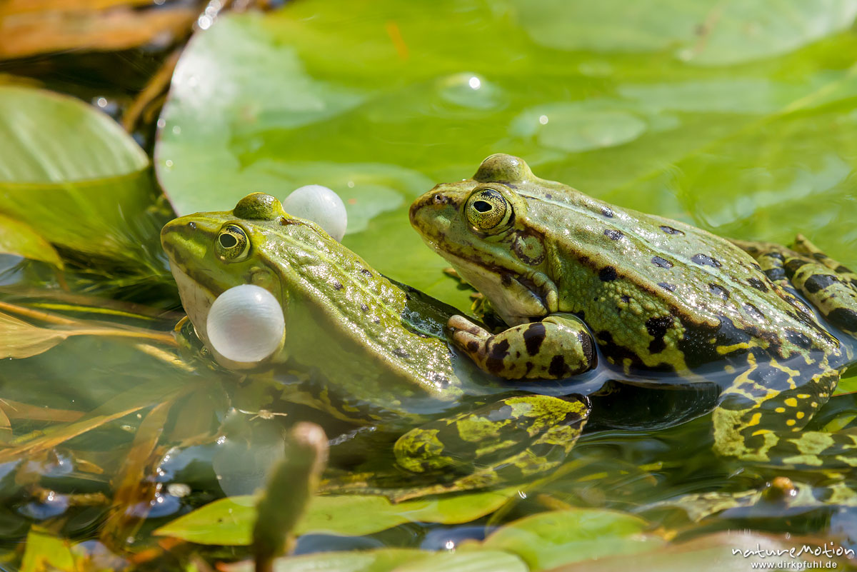Teichfrosch, Rana esculenta (Pelophylax kl. esculentus, Pelophylax "esculentus"), Echte Frösche (Ranidae), mehrere Männchen kämpfen um die besten Plätze im Teich, Alter botanischer Garten, Göttingen, Deutschland