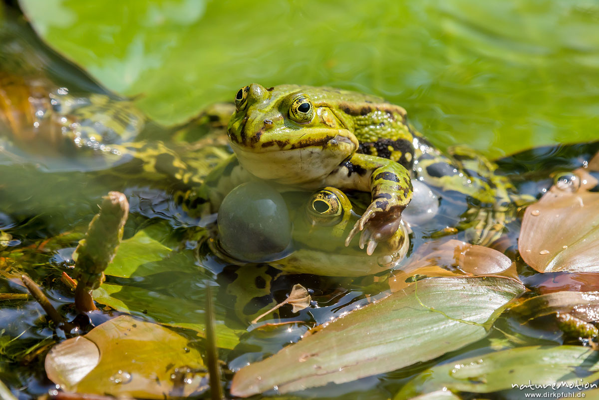 Teichfrosch, Rana esculenta  (Pelophylax kl. esculentus, Pelophylax "esculentus"), Echte Frösche (Ranidae), mehrere Männchen kämpfen um die besten Plätze im Teich, Alter botanischer Garten, Göttingen, Deutschland