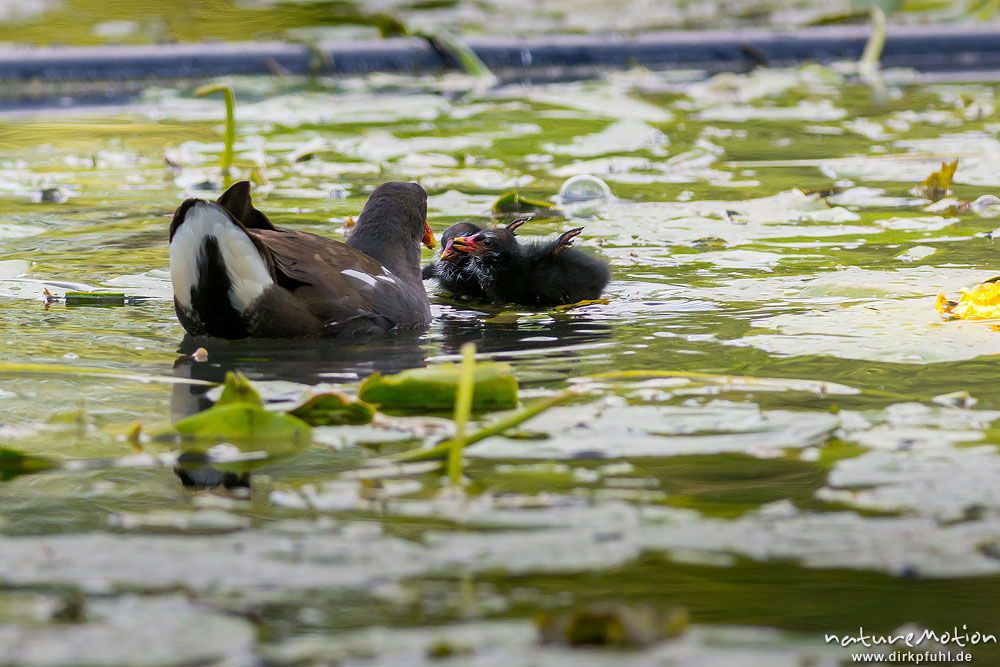 Teichralle, Teichhuhn, Gallinula chloropus, Rallenvögel (Rallidae), Alttier füttert Küken zwischen Teichrosen, Nestbau auf Zulaufbauwerk, Levinscher Park, Göttingen, Deutschland