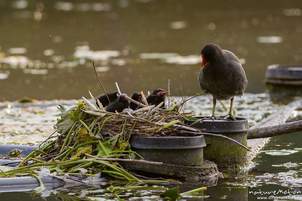 Teichralle, Teichhuhn, Gallinula chloropus, Rallenvögel (Rallidae), Alttier neben Küken im Nest, Nestbau auf Zulaufbauwerk, Levinscher Park, Göttingen, Deutschland