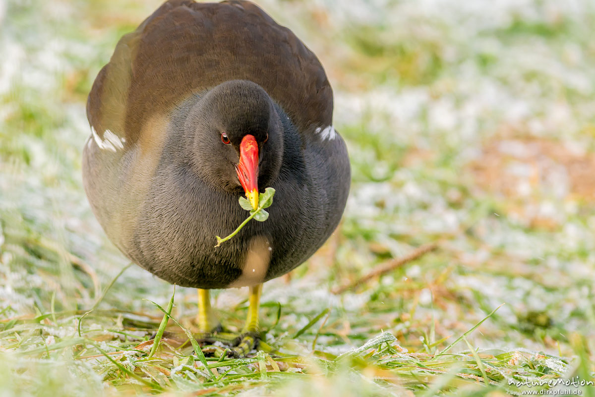 Teichralle, Teichhuhn, Gallinula chloropus, Rallenvögel (Rallidae), auf Nahrungssuche auf der Uferwiese, Raureif, Kiessee, Göttingen, Deutschland