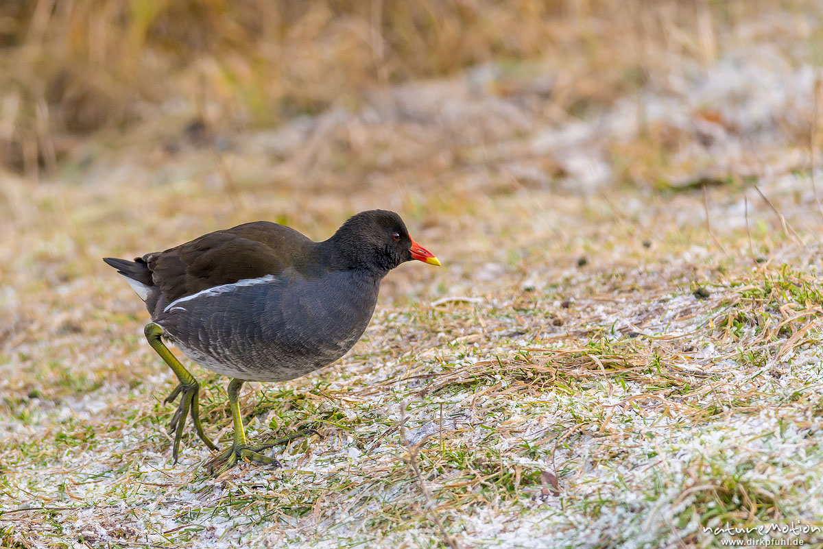 Teichralle, Teichhuhn, Gallinula chloropus, Rallenvögel (Rallidae), auf Nahrungssuche auf der Uferwiese, Raureif, Kiessee, Göttingen, Deutschland