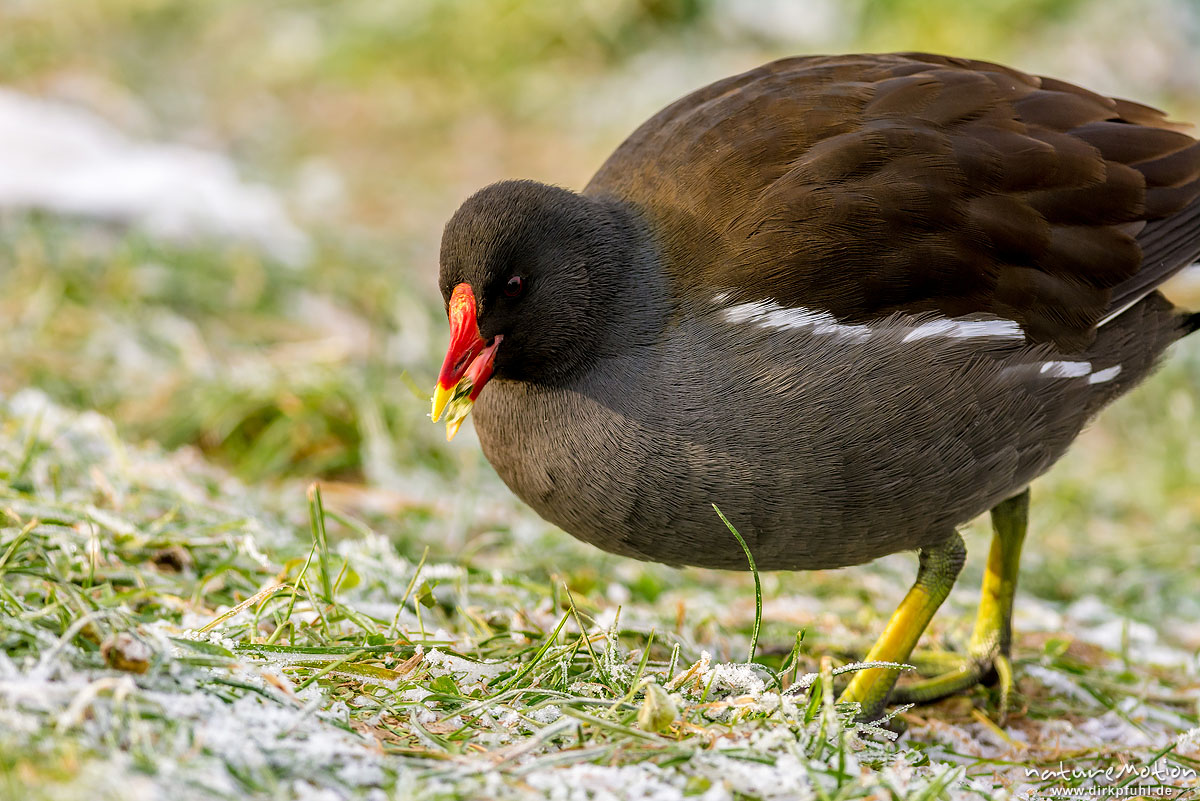 Teichralle, Teichhuhn, Gallinula chloropus, Rallenvögel (Rallidae), auf Nahrungssuche auf der Uferwiese, Raureif, Kiessee, Göttingen, Deutschland