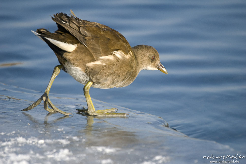Teichralle, Teichhuhn, Gallinula chloropus, Rallenvögel (Rallidae), Jungvogel, auf Eis, Leine Göttingen, Deutschland