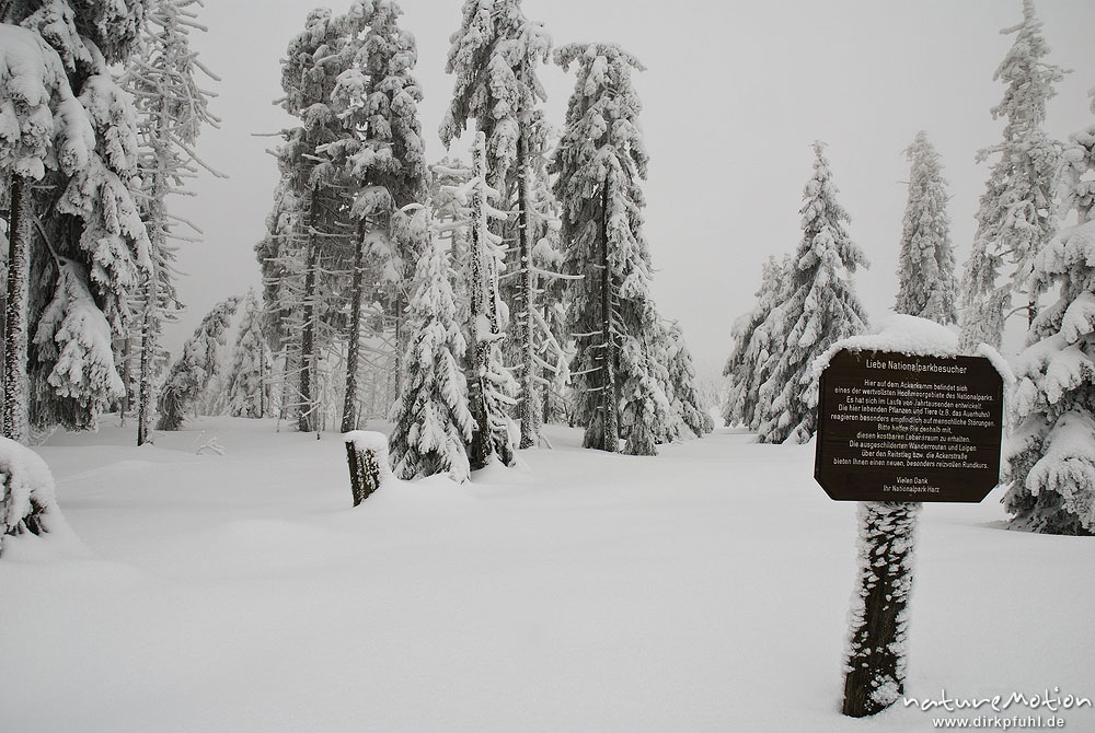tief verschneiter Fichtenwald, vereiste Fichten, Schild Nationalpark, Stieglitzeck, Harz, Deutschland