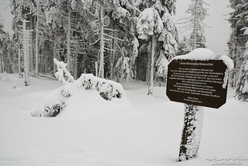 tief verschneiter Fichtenwald, vereiste Fichten, Schild Nationalpark, Stieglitzeck, Harz, Deutschland