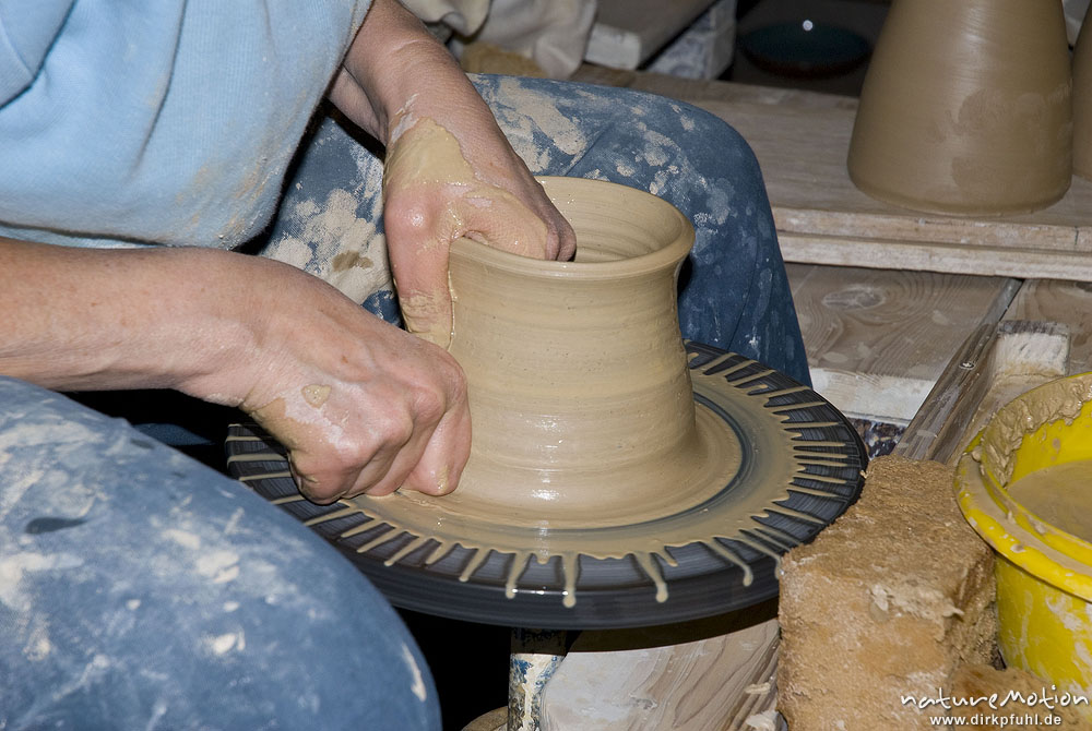 Töpferin an Fussgetriebener Töpferscheibe, Hände formen den Ton, Museum Hessenpark, Neu-Anspach, Deutschland