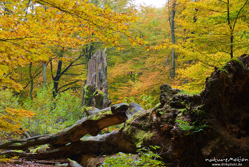 Totholz, Baumstumpf und umgestürzter Stamm einer alten Buche, Herbstlaub, Urwald Sababurg, Deutschland