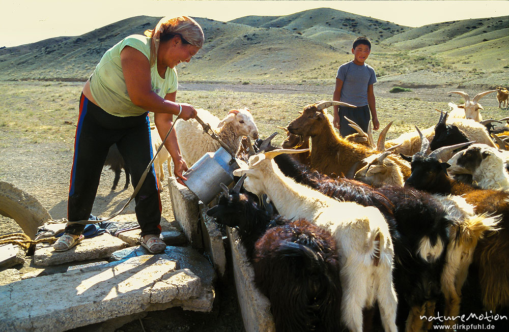 Tr?nke, Frau tr?nkt Ziegen an Ziehbrunnen W?ste Gobi, Mongolei