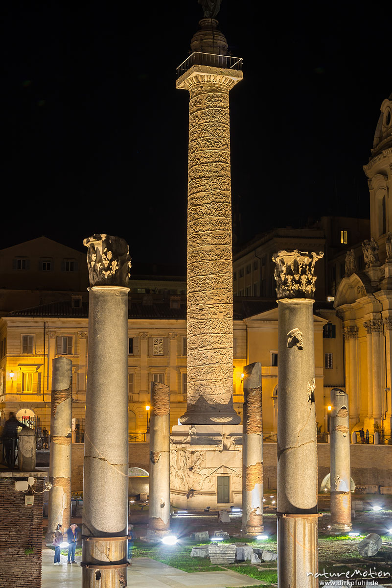 Trajansäule, bei Nacht, angeleuchtet, Forum Imperiali, Rom, Italien