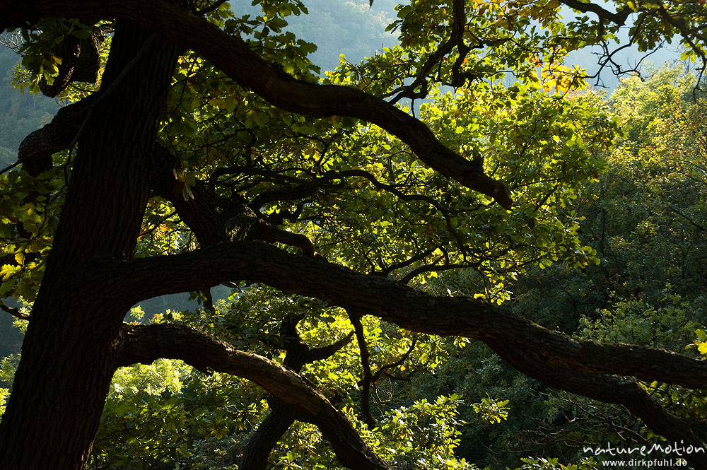 Traubeneiche, Quercus petraea, Fagaceae, Silhouette im Gegenlicht, Bodetal, Deutschland