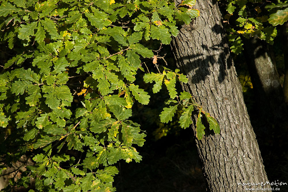 Traubeneiche, Quercus petraea, Fagaceae, Stamm und Blätter, Bodetal, Deutschland
