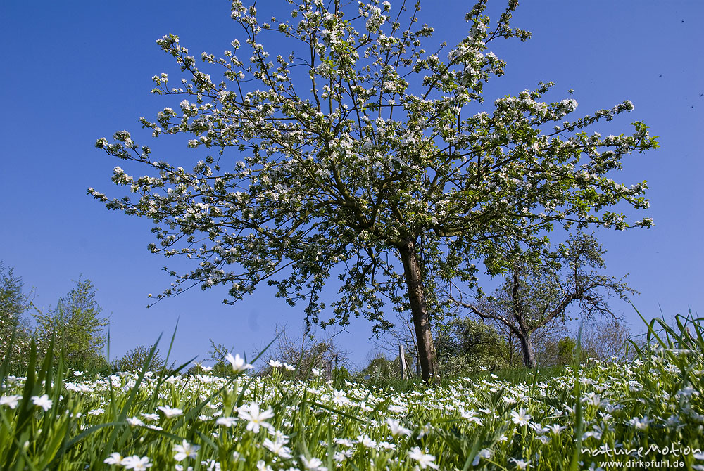 Traubenkirsche, Prunus padus, Rosaceae, blühende Bäume, darunter ein Teppich von blühender Sternmiere, Wendebachstausee, Reinhausen bei Göttingen, Deutschland