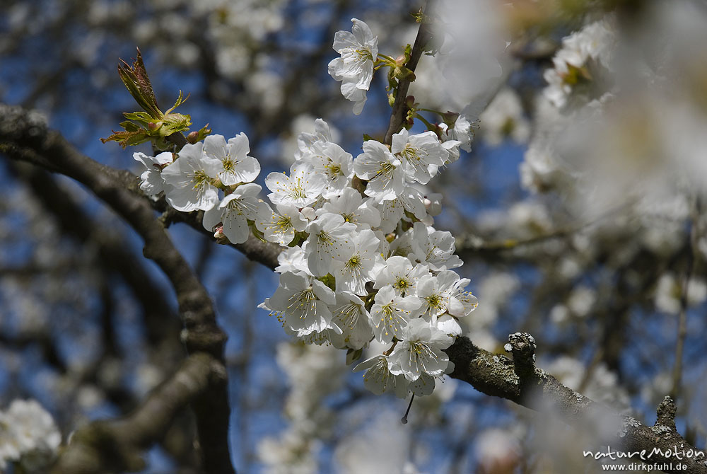 Traubenkirsche, Prunus padus, Rosaceae, blühende Zweige vor blauem Himmel, Wendershausen bei Witzenhausen, Deutschland