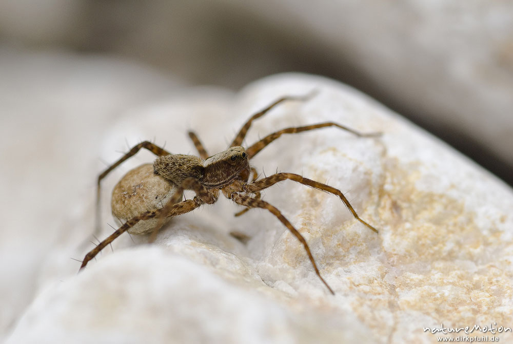 Trauerwolfsspinne, Pardosa lugubris, Wolfspinnen (Lycosidae), Weibchen mit Eikokkon, Kalkfelsen an Bachmündung, Bohinjer See Wocheiner See, Slowenien