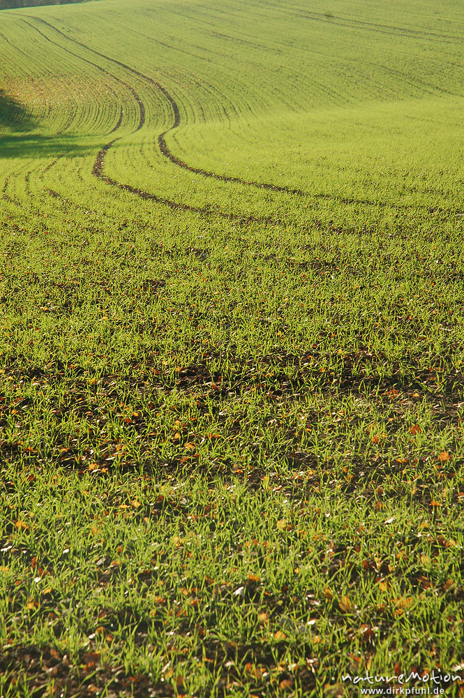 Treckerspuren in Acker mit grünem Winterweizen, Abendlicht, Herberhausen bei Göttingen Göttingen, Deutschland