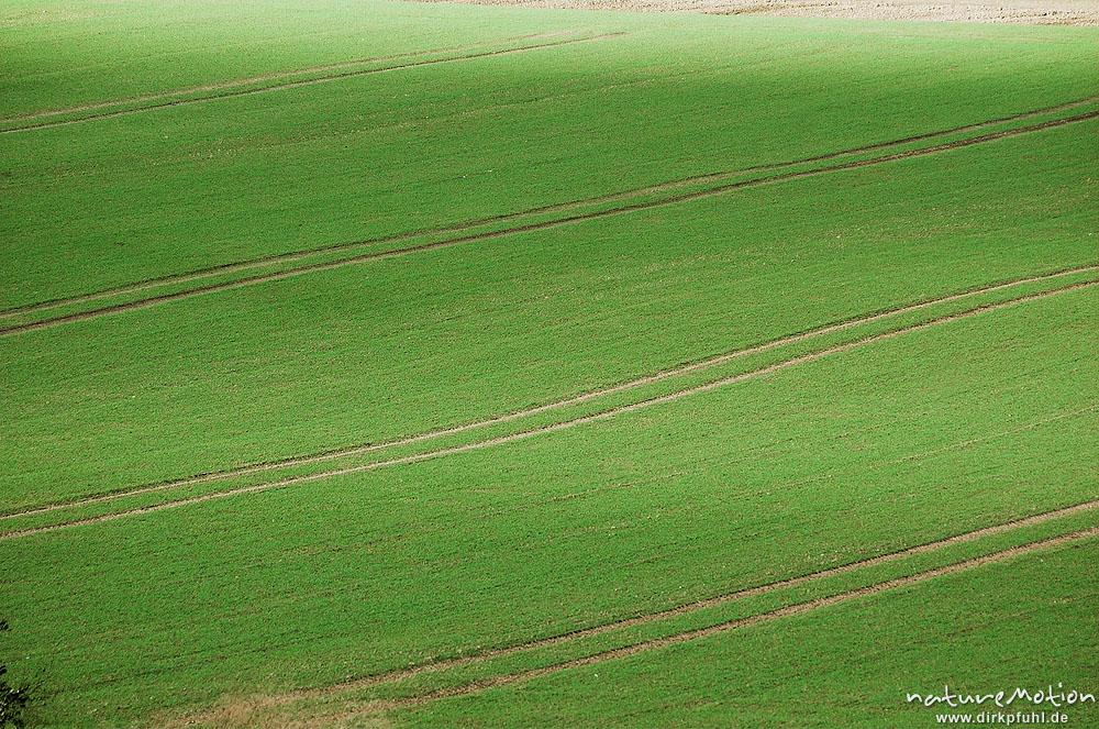 Treckerspuren in Wintergetreide-Feld, Wolkenschatten, Leinetal, Göttingen, Deutschland