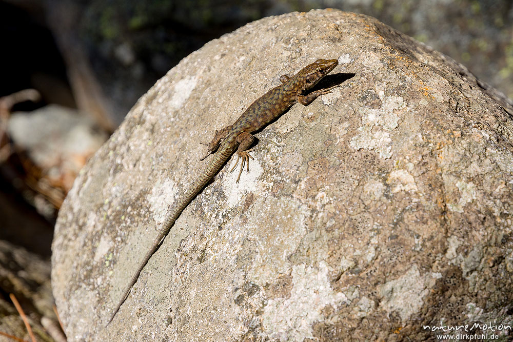 Tyrrhenische Gebirgseidechse, Lacerta bedriagae, Archaeolacerta bedriagae, Lacertidae, Tier sonnt sich auf Felsen, Aitone-Bach, Cascade d'Aitone, A nature document - not arranged nor manipulated, Korsika, Frankreich