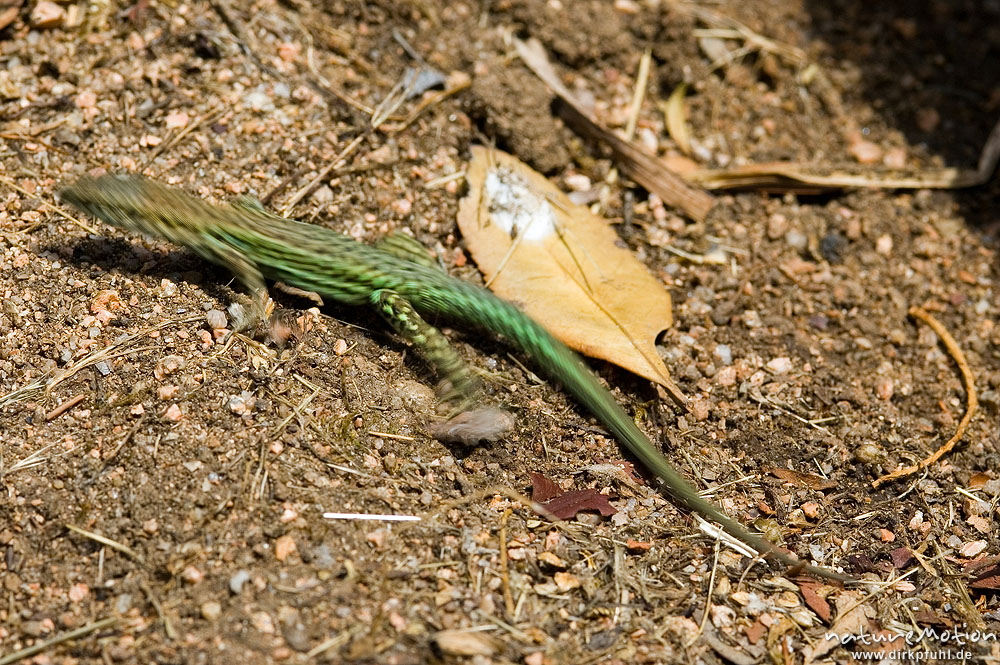 Tyrrhenische Mauereidechse, Podarcis tiliguerta, huscht gerade weg, Campingplatz l'Asciasgju nähe Plage de Palombaggia, Korsika, Frankreich