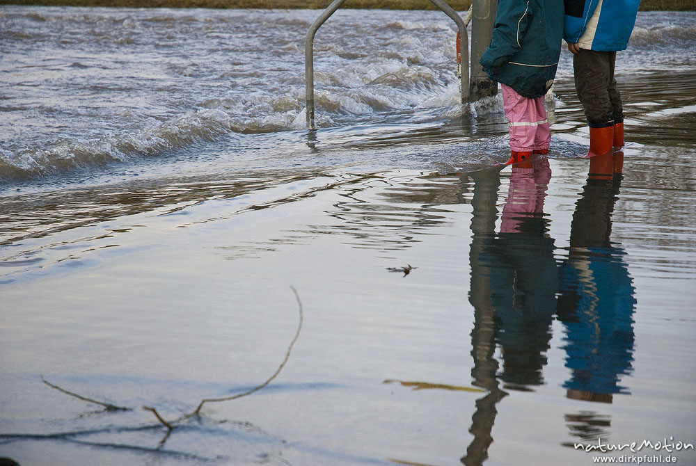 überschwemmte Straße, Kinder stehen mit Gummistiefeln im Wasser, Sandweg am Kiessee, Göttingen, Deutschland