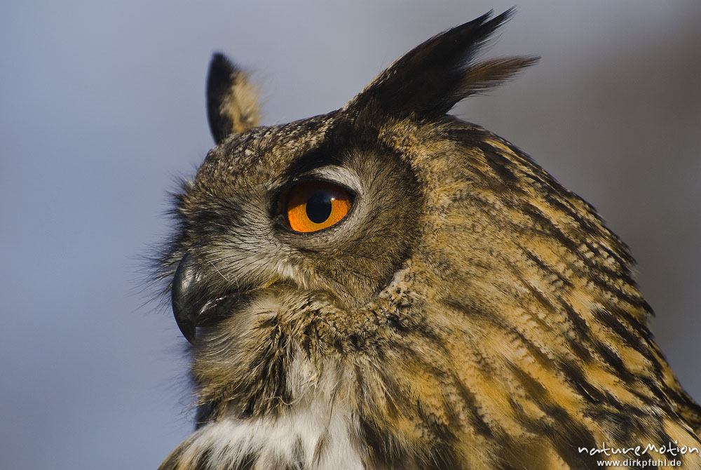 Uhu, Bubo bubo, Eigentliche Eulen (Strigidae), Kopf und Augen, Flugschau "Mittelalterliche Falkenerei", Schloß Berlepsch, captive, Witzenhausen, Deutschland