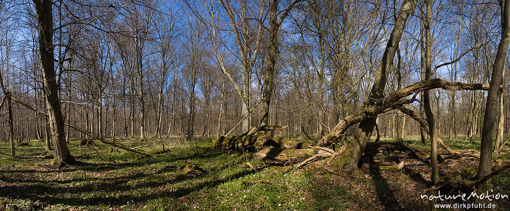 umgestürzter, verwitterter Baum in lichtem Frühlingswald, Buchenwald, Settmarshausen bei Göttingen, Deutschland