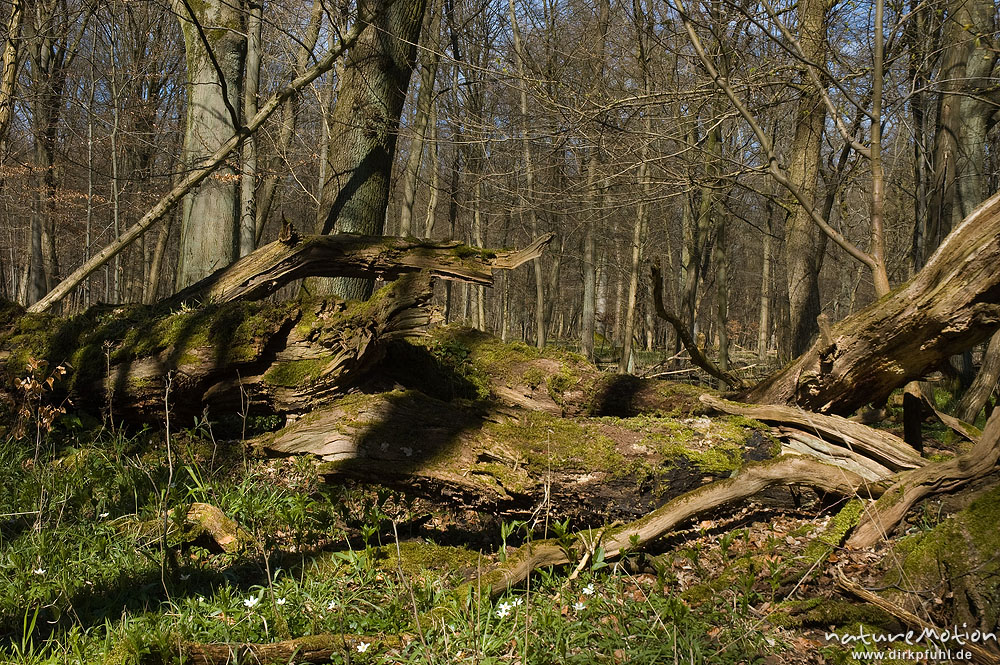 umgestürzter, verwitterter Baum in lichtem Frühlingswald, Buchenwald, Settmarshausen bei Göttingen, Deutschland